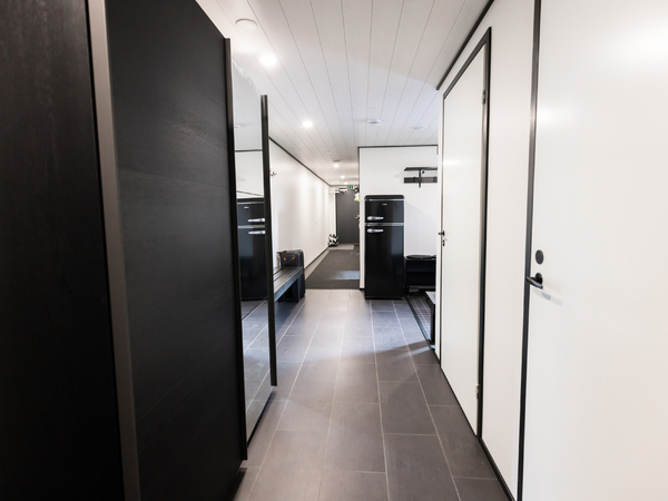 Saunaosaston pukuhuone on tilava ja varustettu omalla jääkaapilla saunojia varten. Suihkuja löytyy 4 kappaletta ja saunaan mahtuu noin 12 henkeä.
