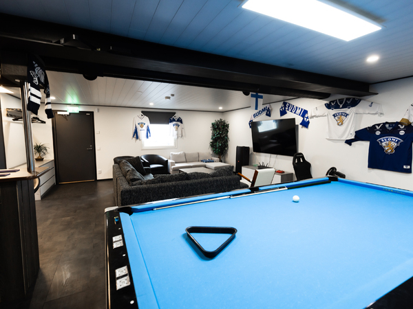 Oleskelutilasta löytyy iso 12 hengen pöytä, kädenvääntöpöytä, pingispöytä, 75 tuumainen tv, JBL 1000 kaiutin, vanhan ajan flipperi ja pikapokeri pelikoneet, iso jääkaappi ja pieni sohvaryhmä.